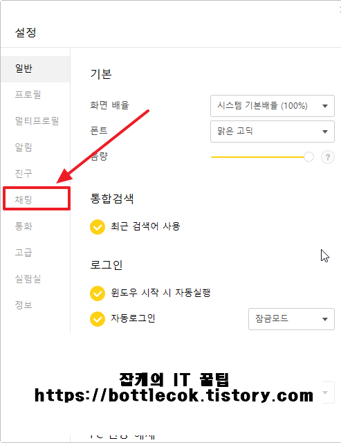 설정에 들어오시면 여러가시 카테고리들이 있어요. 일반에서는 기본 화면 배율이라던지 폰트, 음향 등 기본세팅들을 바꿀 수 있고 알림, 친구 등 여러 설정값들을 바꿀 수 있어요. 저희는 다운로드 폴더의 경로를 변경하기 위해 [채팅]으로 이동해줍시다. 다운로드를 채팅창에서 받아서 채팅에 있는건지... 잘모르겠지만 채팅카테고리에 있더라구요.